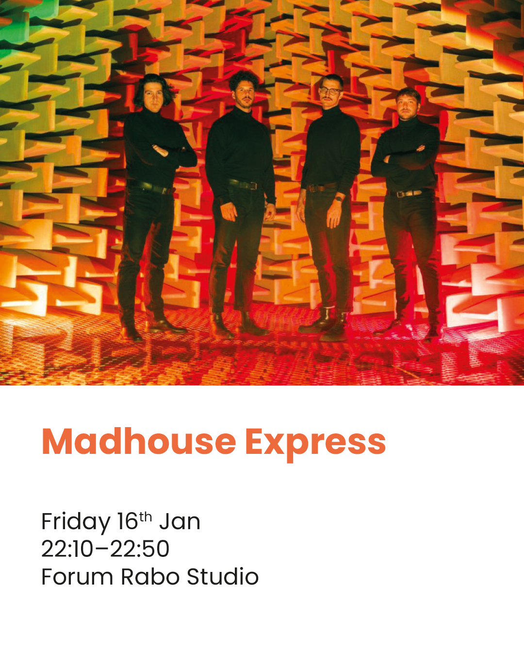 On Friday evening, two Czech acts will also appear on the festival stages. The first to perform will be Madhouse Express, an energetic rock band playing on Friday, January 16, from 22:10 to 22:50 at Forum Rabo Studio. Their show will be followed by Barbora Hora, whose folk set will take place late on Friday night, from 23:30 to 00:10 at the USVA venue.